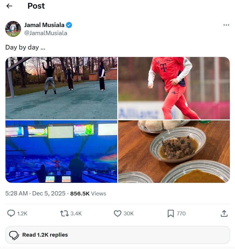 Baru-baru ini Jamal Musiala terlihat memposting foto hidangan a’la Nigeria, termasuk ubi tumbuk dan sup egusi di akun X pribadinya. Pemain yang kini masih berusia 22 tahun itu juga menambahkan caption dalam postingannya tersebut, yakni ‘hari demi hari’.