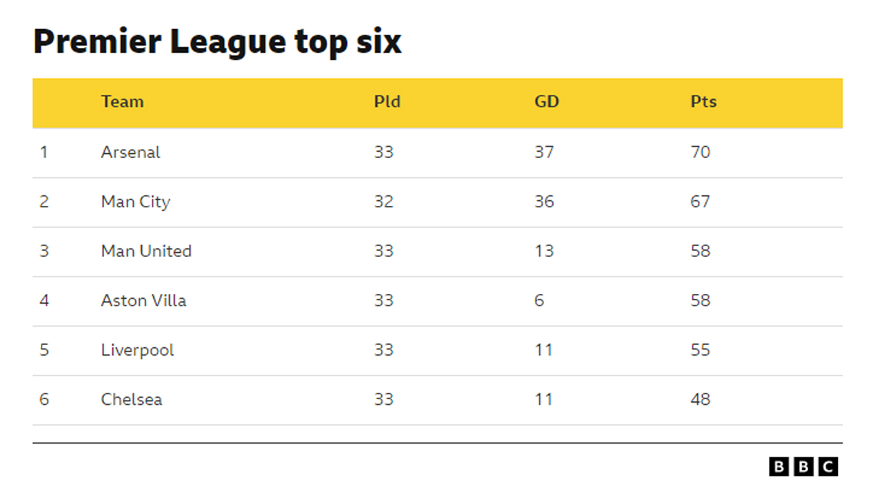 Musim ini, lima tim teratas Premier League semuanya lolos ke Liga Champions. Arsenal dan Manchester City, yang sama-sama berambisi meraih gelar juara, sudah dipastikan finis di lima besar.
