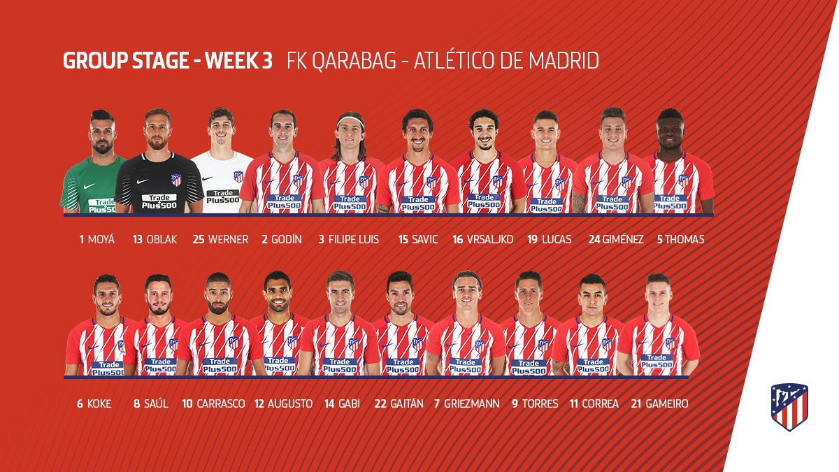Skuat yang dimiliki Diego Simeone pada pertandingan kali ini hampir seluruhnya bisa dimainkan di laga tengah pekan yang akan berlangsung di Azerbaijan, tetapi tidak semua pemain terpilih untuk masuk skuat utama.