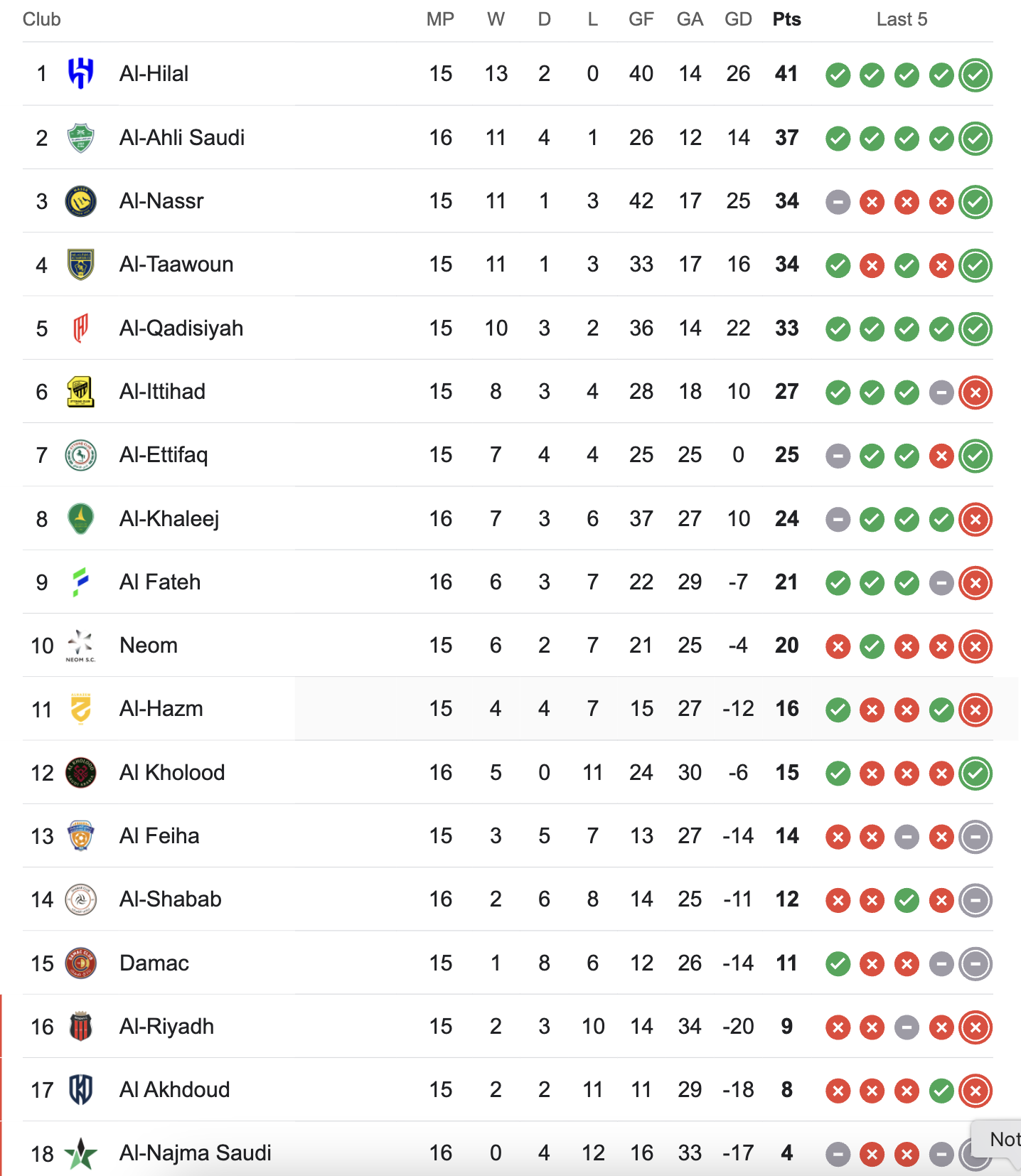 Sementara itu, Al Hilal juga belum memainkan pertandingan pekan ke-17. Mereka akan menjamu Al Feiha dan berpeluang memperlebar keunggulan di puncak klasemen jika mampu meraih kemenangan.