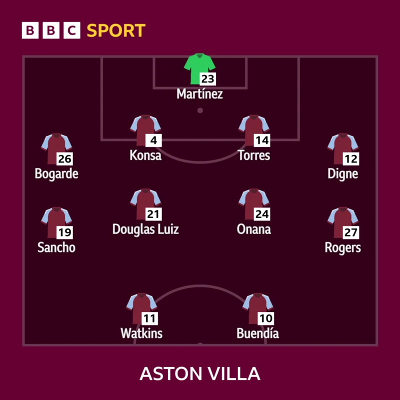 Starting XI Aston Villa: Martínez, Bogarde, Konsa, Torres, Digne, Luiz, Onana, Rogers, Sancho, Buendia, Watkins.